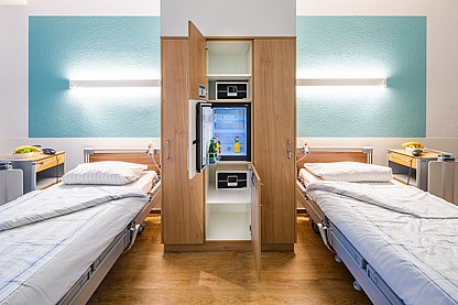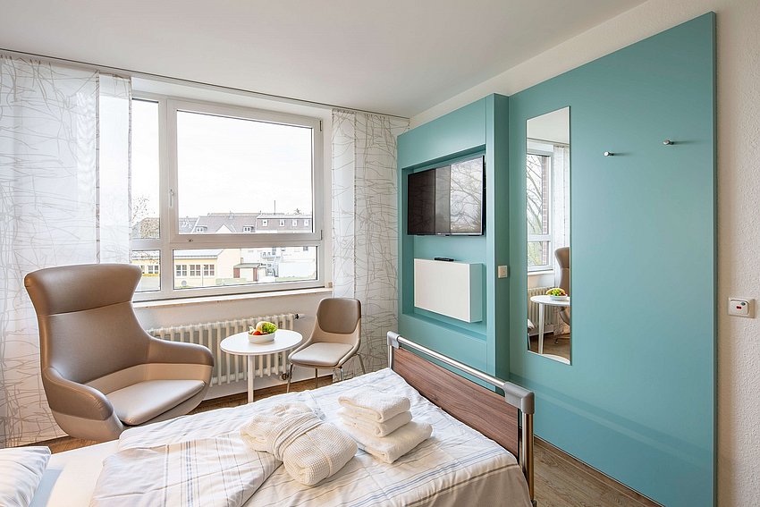 Jedes der Ein- und Zweibettzimmer ist modern und hochwertig ausgestattet und verfügt über eine bodenbündige Nasszelle. Der fest verbaute Safe mit Zahlenschloss bietet eine sichere Aufbewahrung der Wertsachen. Auch ein kostenfreier Zugang zum Internet sowie ein besonderes Speisenangebot der krankenhauseigenen Küche sind Teil des Serviceangebotes. Zwischen den Mahlzeiten lädt die neue große Lounge zum Verweilen ein udn bietet ein umfangreiches Heißgetränkeangebot.