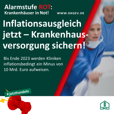 Durch die inflationsbedingten Kostensteigerungen werden die Krankenhäuser in Deutschland bis Ende des Jahres 2023 ein Defizit von rund 10 Milliarden Euro angehäuft haben. Zu den Kostenbelastungen gehört auch die nur teilweise gesicherte Refinanzierung der Tarifsteigerungen. Und für 2024 sind nach dem Tarifabschluss im Öffentlichen Dienst weitere Kostensteigerungen absehbar. Die Kliniken fordern am bundesweiten Aktionstag die Politik auf, verlässliche Rahmenbedingungen zu schaffen, damit sie wieder in wirtschaftlicher Sicherheit verlässlich ihre Arbeit planen können.