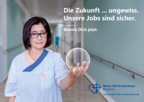 Gerade zu Beginn der Corona Krise haben wir als Maria-Hilf-Krankenhaus (MHK), insbesondere die Pflege, viel Zuspruch erfahren. Daran wollen wir mit unserer neuen Kampagne anknüpfen. In den letzten Wochen hat dafür ein internes Projektteam kreative Ideen entwickelt. Daraus sind drei finale Motive entstanden. Jedes einzelne Motiv stellt wichtige Eigenschaften der Pflege im MHK in den Fokus: Die Pflege ist stark, standfest und der Arbeitsplatz ist sicher! Das übergeordnete Ziel der Kampagne ist es, auf unser Krankenhaus als Arbeitgeber aufmerksam zu machen und neue qualifizierte Pflegekräfte zu gewinnen.