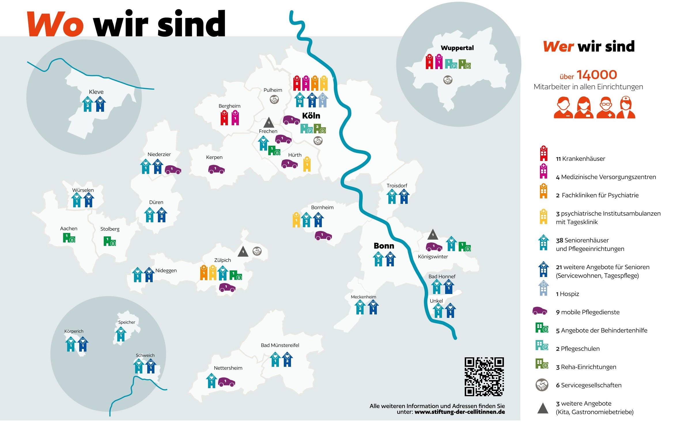 Zur katholischen Stiftung der Cellitinnen mit Sitz in Köln gehören zahlreiche Einrichtungen im Gesundheitswesen: In 14 Krankenhäusern, Privat- und Fachkliniken, in 38 Senioren- und Pflegeeinrichtungen sowie in 32 mobilen Pflegediensten, Rehakliniken, Medizinischen Versorgungszentren, Einrichtungen der Behindertenhilfe, Schulen und diversen anderen Dienstleistern sind ca. 13.500 Mitarbeitende beschäftigt.